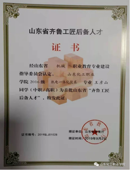 日前,山东省教育厅公布了首批“齐鲁工匠后备人才”名单,其中山东化工职业学院机电工程系2016级机电一体化技术专业的王彦山、王金强、贾玉婷,3名学生成为山东省“齐鲁工匠后备人才”。