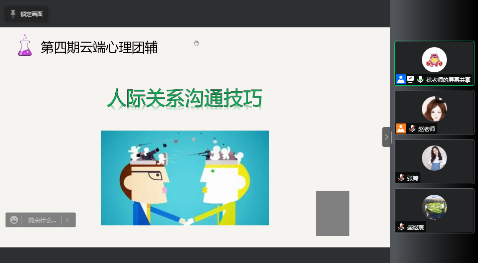 本期云端心理团辅是第二次小规模团体活动,根据同学们咨询最多的人际关系问题确定主题--人际关系沟通技巧,旨在为同学们提供实际有效的帮助。在此次云端心理团辅中,心理老师对每一个同学的提出的实际问题逐一进行了解答,跟同学们共同探讨他们在生活中遇到的人际交往方面的问题,其他与会同学也积极献言建策。讨论完同学们生活中遇到的实际问题后,心理老师还根据同学们的需要,讲授了一些人际交往方面实用的小技巧,希望可以帮助同学们在生活中有效改善我们的人际关系,获得良好的人际关系。