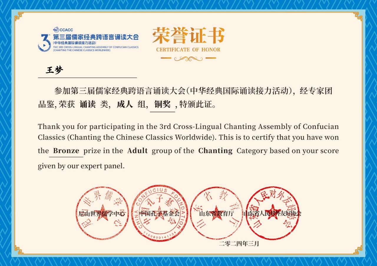 平仄格律,流淌东方美韵;一吟一唱,共话大同梦想。3月30日,由尼山世界儒学中心、中国孔子基金会、山东省教育厅、山东省人民对外友好协会联合主办的第三届儒家经典跨语言诵读大会(中华经典国际诵读接力活动)年度盛典在济南成功举办。山东化工职业学院获得诵读类成人组铜奖1项、写作类潍坊市二等奖1项、写作类优秀奖8项。