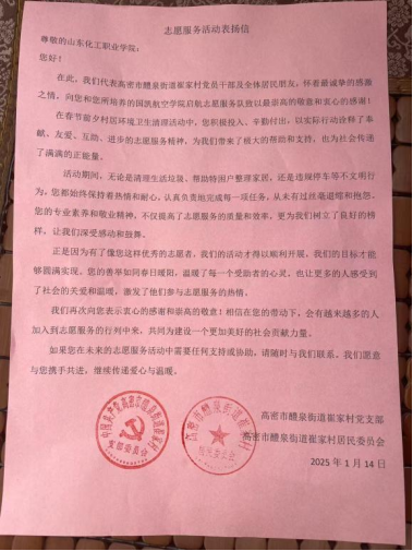崔家村村委对志愿服务队的到来表示热烈欢迎和衷心感谢。村委负责人在表扬信中写道:“在春节前夕的村居环境卫生清理活动中,你们积极投入,辛勤付出,以实际行动诠释了奉献、互爱、互助、进步的志愿服务精神,为我们带来了极大的帮助和支持,也为社会传递了满满的正能量。再次向你们表示衷心的感谢和崇高的敬意,相信在你们在带动下,会有越来越多的人加入到志愿服务的行列中来,共同为建设一个更加美好的社会而贡献自己的力量。”