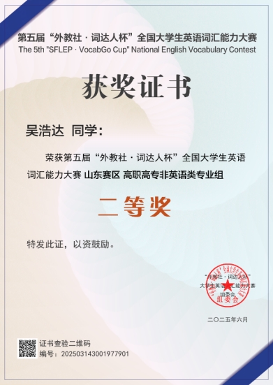 近日,第五届“外教社・词达人杯”全国大学生英语词汇能力大赛省赛获奖名单揭晓。国凯航空学院学子凭借扎实的英语基础与出色的竞技表现,在激烈的角逐中脱颖而出,2023级机场运行服务与管理专业吴浩达同学荣获二等奖,2023级空中乘务专业许仪春同学荣获三等奖。