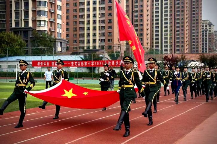 在庆祝中华人民共和国成立75周年之际,我校国凯航空学院国旗护卫队受邀来到潍坊市奎文区孙家小学,举行了一场庄严而隆重的升旗仪式。此次活动旨在弘扬爱国主义精神,激发孩子们对祖国的热爱和自豪感,同时也为伟大祖国的生日献上一份特别的礼物。