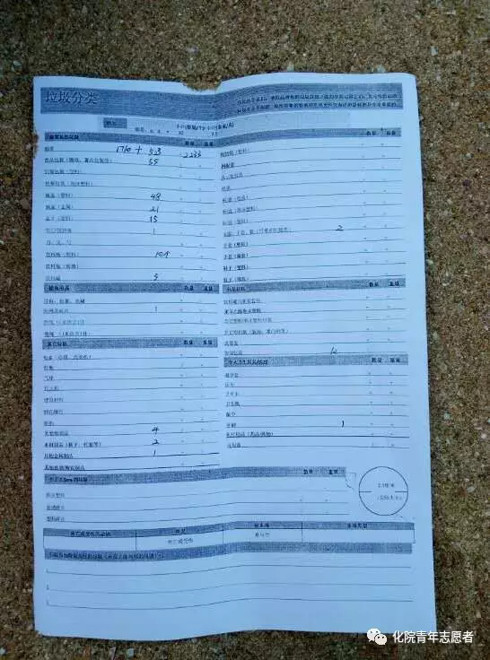 下图为本次垃圾分类统计表,以及志愿者与志愿小天使进行大体统计的场景。