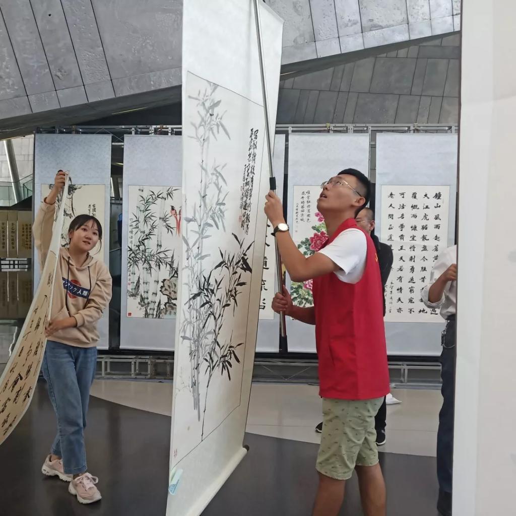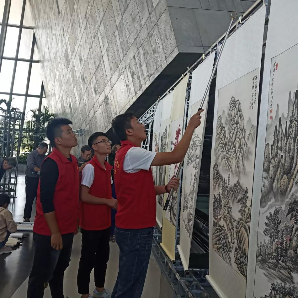 我院志愿者于9月22日前往城市艺术中心提前为书画展布置现场。搬运、整理、布置,我院志愿者用一上午时间将来自潍坊多个地区的书画作品一一布置好。