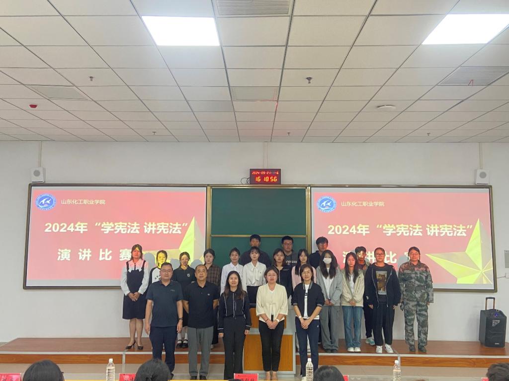 9月21日,由学生工作处、团委主办的山化院学生“学宪法 讲宪法”演讲比赛和知识素养竞赛分别在阶梯10教室和4303教室顺利举行。宣传统战部部长杨张欣、基础教学部主任、党支部书记刘建伟、教务科研处副处长郑艳玲、党政办公室主任助理刘宁、学生工作处副处长、团委书记朱怀红担任本次演讲比赛评委。大赛由管理工程学院2024级李瑞雪同学主持。