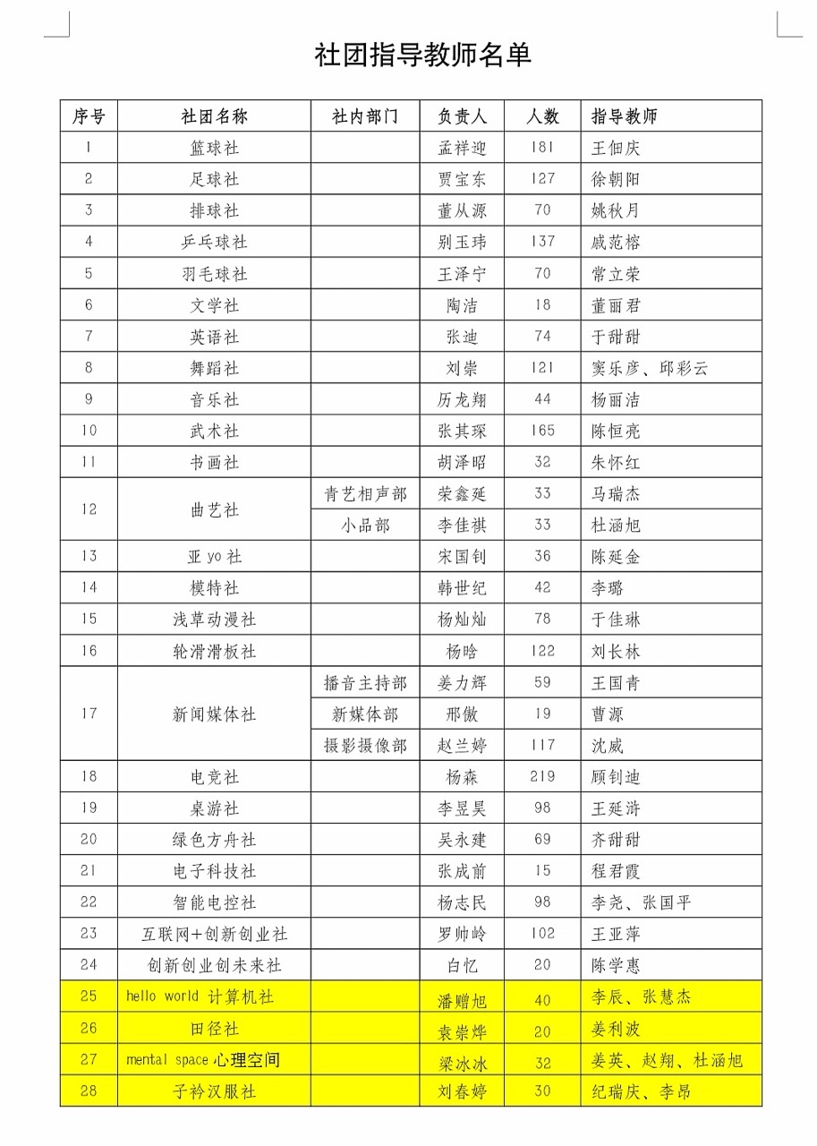 目前,我校共有社团28个,其中hello world 计算机社、mental space 心理空间 、田径社、子衿汉服社4个社团为本年度新成立社团。