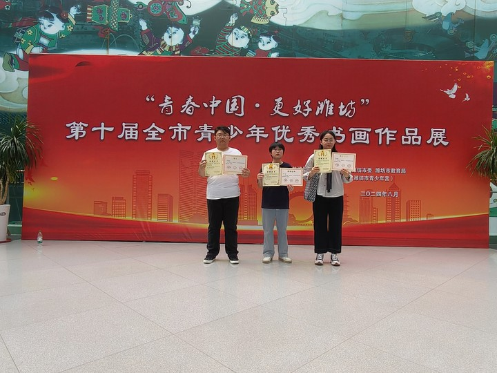 近日,由中共潍坊市委宣传部、共青团潍坊市委、潍坊市教育局联合举办的“青春中国·更好潍坊”——第十届全市青少年书画大赛公布获奖结果,本届书画作品共收到作品4000余幅,我校何崇禧的作品《沁园春尝试》、王佳琳的作品《青春中国·大美鸢都》荣获一等奖2项,刘涵的作品《怀潍县》荣获三等奖1项,我校书画社指导教师李金昭荣获“优秀艺术教育工作者”荣誉称号。另,我校为支持希望工程事业发展,关爱帮扶困境青少年成长发展,共捐赠出8幅作品。