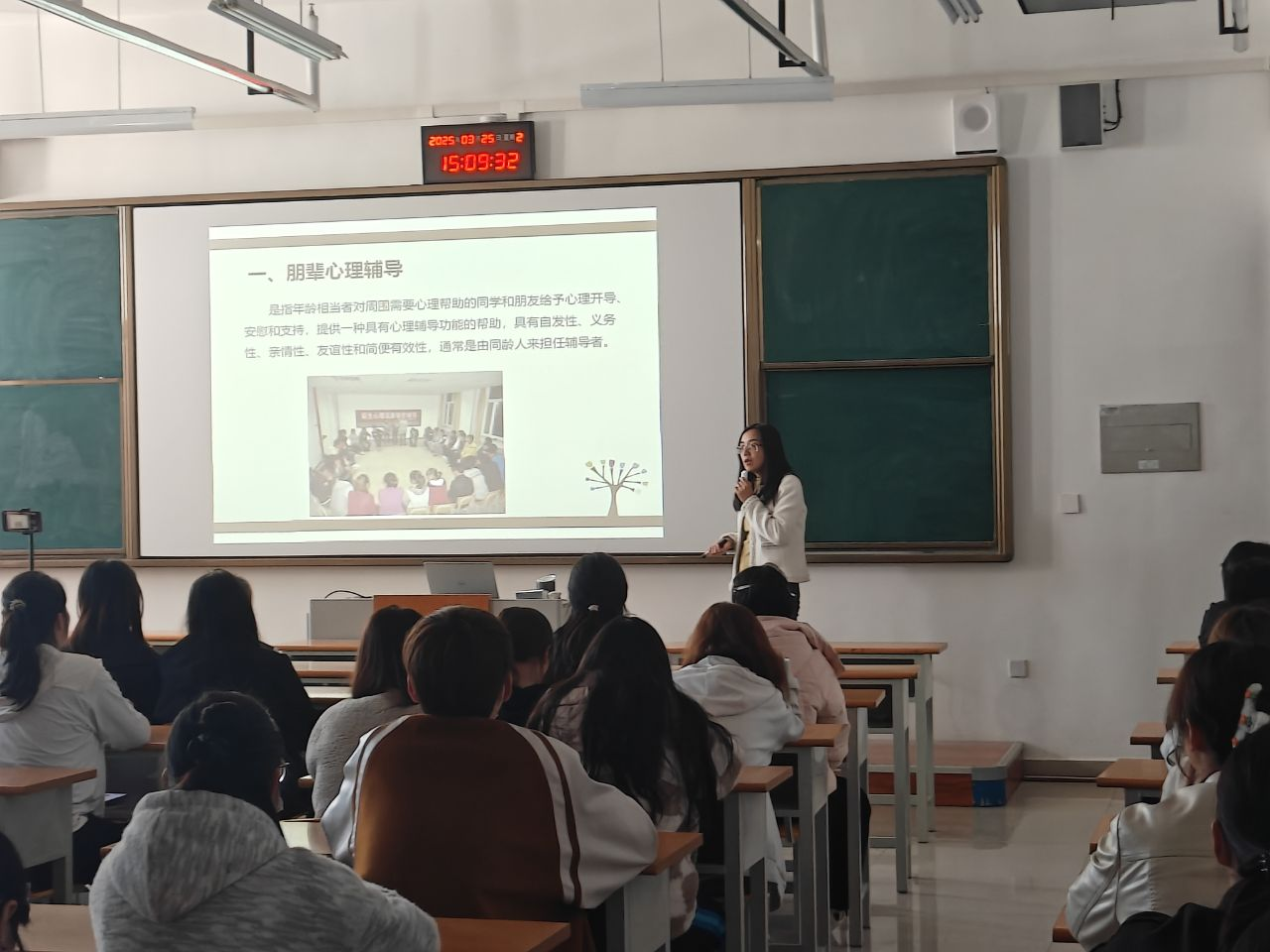 讲座伊始,赵翔通过"宿舍矛盾调解""学业压力疏导"等典型案例切入,系统阐释朋辈心理辅导在校园四级心理防护网中的关键作用。"同龄人间的理解共鸣是最天然的心理疏导剂",赵老师强调,朋辈辅导员既是心理动态的"观察员",也是危机预警的"前哨站",更是温暖陪伴的"守护者",要通过专业培训将自发性互助转化为规范化支持。