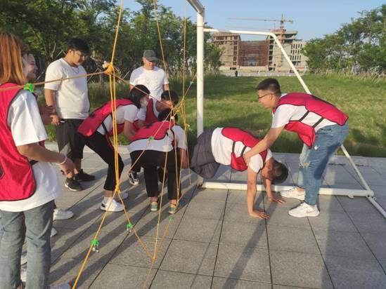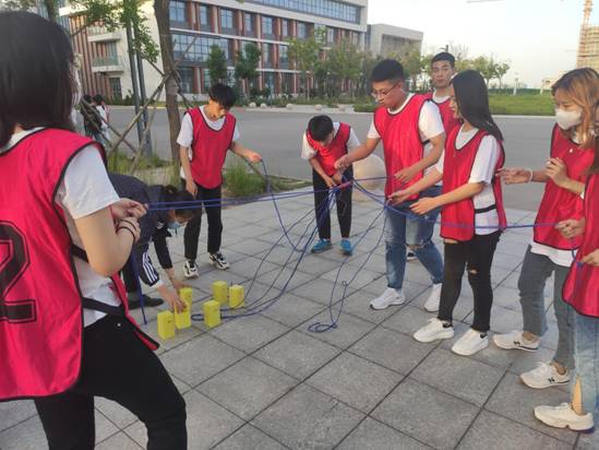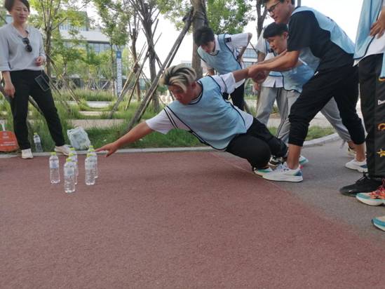 在团队合作闯关活动中,各二级学院派出1位老师和7名同学组成参赛队伍进行比赛。