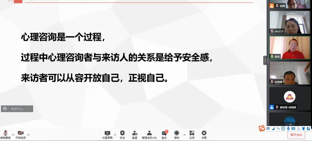 本次线上会议除了心理疏导工作小组的全体成员,各二级学院学生心理健康工作负责人、辅导员和班主任也参加了本次会议。本次会议首先由我校心理疏导小组的姜英老师和时颖老师结合自己在心理辅导工作中的案例分享心理问题疏导技巧,并强调在心理辅导工作中共情的重要性,一定要注意帮助学生消化疫情期间的负面情绪;接着由各二级学院老师提出在心理辅导工作中遇见的疑难问题,姜英老师和时颖老师针对每个问题提供了具体解决策略并进行经验分享。