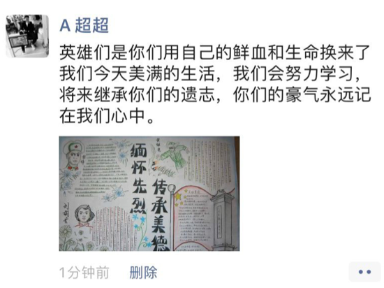 同学们在微信、QQ等社交软件的朋友圈,发布手写祭奠英烈寄语、致敬英雄手绘画等作品,以此表达对革命先烈的景仰和追思。一张张精美的手抄报,一段段饱含深情的文字,寄托同学们对革命先辈、英雄的缅怀之情。
